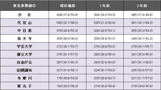 東急東横線(渋谷~横浜)の平均坪単価は252万円で、1年前から1.9%、5万円上昇した。事例数は4858件(前年より731件減)、平均築年数が26.9年(1年前26.0年)、平均専有面積は60.21平方メートル(同58.72平方メートル)。今回掲載区間(渋谷~新丸子)における最高値は代官山の565万円。