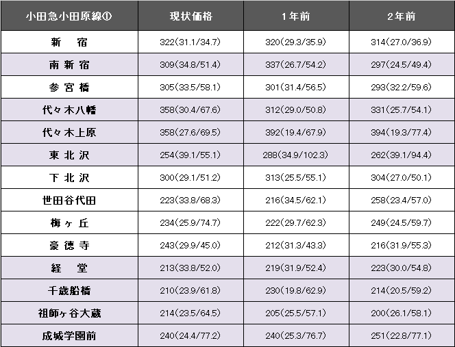 小田急小田原線(新宿~小田原)の平均坪単価は143万円で、1年前から8.7%、14万円下落した。事例数は5844件(前年より151件増)、平均築年数が28.9年(1年前27.2年)、平均専有面積は64.66平方メートル(同62.25平方メートル)。今回掲載区間(新宿~成城学園前)における最高値は代々木八幡と代々木上原の358万円。