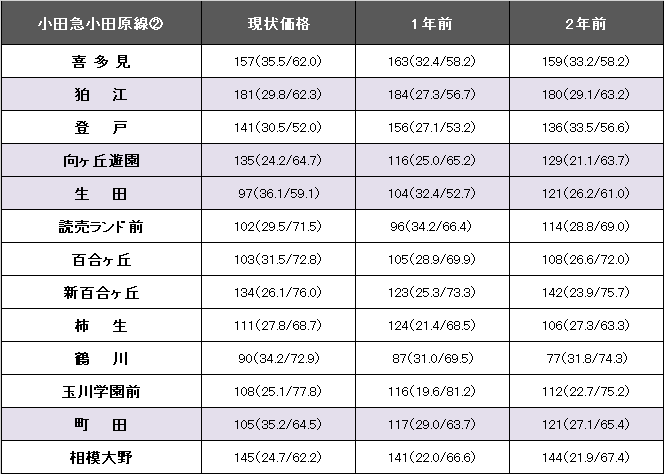 小田急小田原線(新宿~小田原)の平均坪単価は143万円で、1年前から8.7%、14万円下落した。事例数は5844件(前年より151件増)、平均築年数が28.9年(1年前27.2年)、平均専有面積は64.66平方メートル(同62.25平方メートル)。今回掲載区間(喜多見~相模大野)における最高値は狛江の181万円。