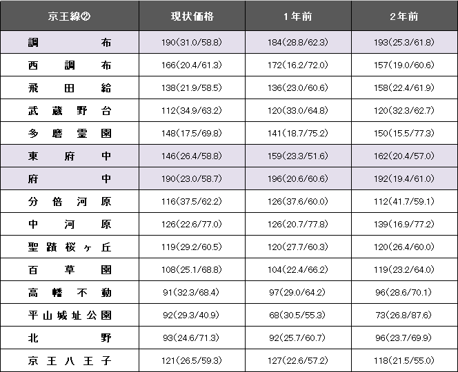 京王線(新宿~京王八王子)の平均坪単価は182万円で、1年前から2.5%、5万円下落した。事例数は3178件(前年より556件減)、平均築年数が28.5年(1年前27.0年)、平均専有面積は56.72平方メートル(同56.48平方メートル)。今回掲載区間(調布~京王八王子)における最高値は調布と府中の190万円。