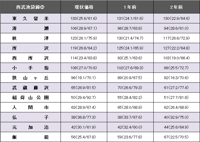 西武池袋線(池袋~飯能)の平均坪単価は163万円で1年前から6万円下落。事例数は3266件(前年より360件減)、平均築年数が27.3年(1年前26.6年)、平均専有面積は58.17平方メートル(同54.45平方メートル)。掲載区間の最高値は東久留米の133万円。