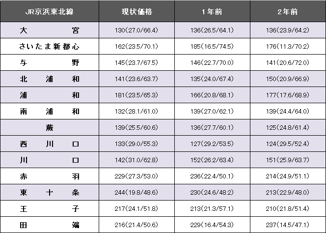 JR京浜東北線(大宮~田端)の平均坪単価は154万円で、1年前から1.0%、2万円下落した。事例数は4184件(前年より138件減)、平均築年数が26.8年(1年前25.1年)、平均専有面積は60.43平方メートル(同61.08平方メートル)。同路線の最高値は東十条の244万円。