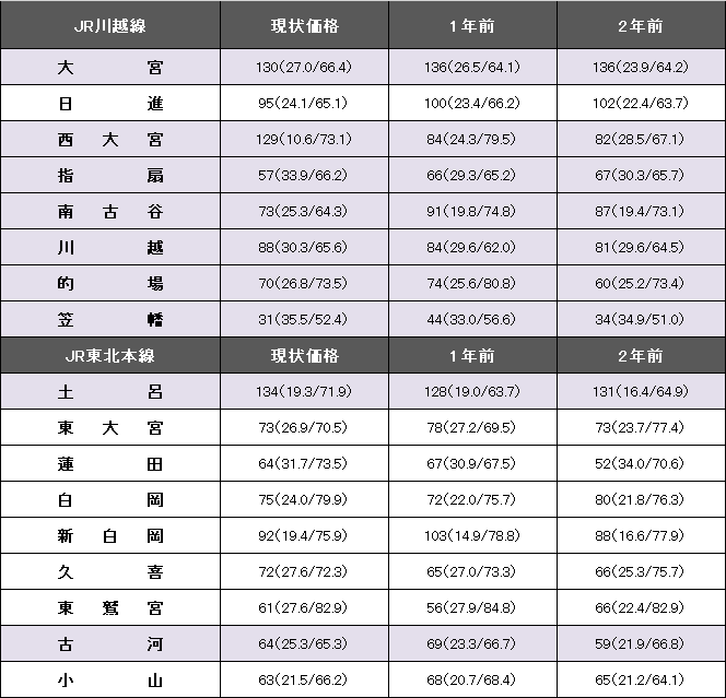 JR東北本線(大宮~小山)の平均坪単価は103万円で、1年前から4万円下落した。事例数は1120件(前年より75件増)、平均築年数が26.1年(1年前25.9年)平均専有面積は68.93平方メートル(同67.94平方メートル)。同路線の最高値は土呂の134万円。