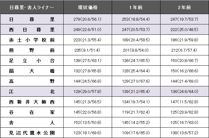 日暮里・舎人ライナー(日暮里~見沼代親水公園)の平均坪単価は209万円で、1年前から9.5%、18万円上昇した。事例数は617件(前年より145件増)、平均築年数が21.9年(1年前19.9年)、平均専有面積は56.44平方メートル(同58.16平方メートル)。同路線の最高値は日暮里の279万円。