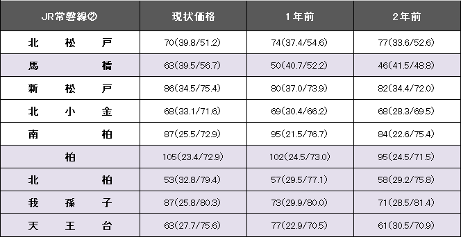JR常磐線(上野~天王台)の平均坪単価は147万円で、1年前から3.9%、5万円上昇した。事例数は3047件(前年より173件減)、平均築年数は25.3年(1年前25.5年)、平均専有面積は64.09平方メートル(同63.52平方メートル)。今回掲載区間(北松戸~天王台)の最高値は柏の105万円。