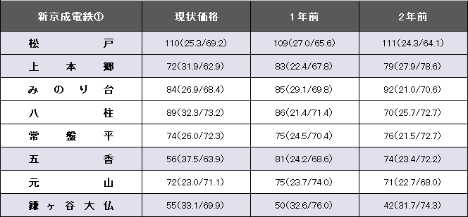 新京成電鉄(松戸~京成津田沼)の平均坪単価は91万円で、1年前と比べて微増(前年比1.1%増)にとどまり、大きな変化はない。事例数は920件で、前年よりも29件減少。平均築年数は27.5年(1年前26.4年)、平均専有面積70.13平方メートル(同70.19平方メートル)。今回掲載区間(松戸~鎌ヶ谷大仏)の最高値は松戸の110万円。