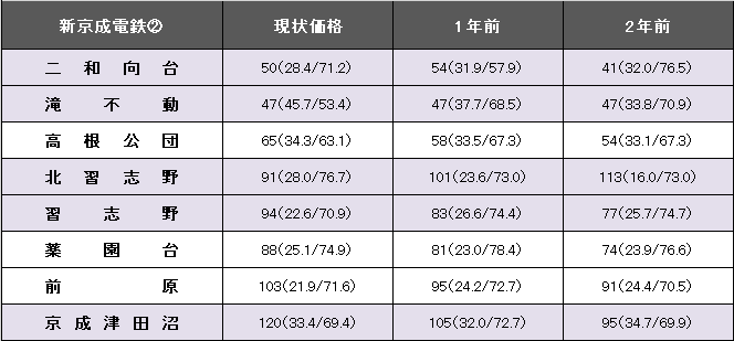 事例数は920件で、前年よりも29件減少。平均築年数は27.5年(1年前26.4年)、平均専有面積70.13平方メートル(同70.19平方メートル)。今回掲載区間(二和向台~京成津田沼)の最高値は京成津田沼の120万円。