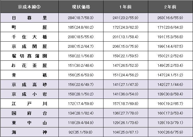 京成本線(日暮里~京成成田)の平均坪単価は138万円で、1年前と比べて7.4%増加となった。事例数は1778件で、前年より16件減少した。平均築年数は27.3年(1年前27.1年)、平均専有面積63.62平方メートル(同64.31平方メートル)。今回掲載区間(日暮里~海神)の最高値は日暮里の284万円。