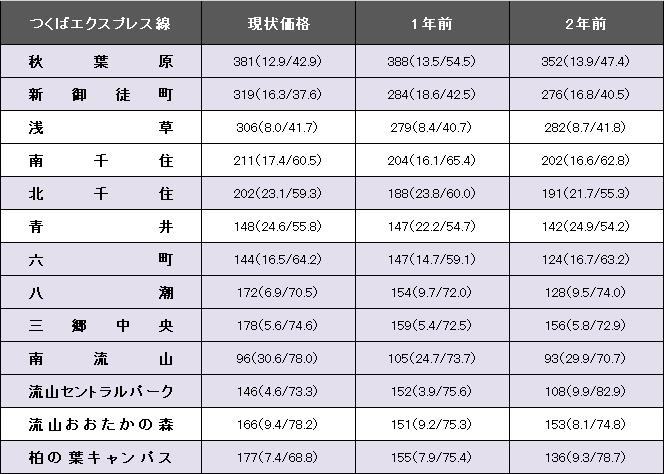 つくばエクスプレス線(秋葉原~柏の葉キャンパス)の平均坪単価は203万円。1年前に比べて1.6%上昇した。事例数は1224件(前年よりも16件減少)、平均築年数が17.4年(1年前は16.7年)、平均専有面積は60.51平方メートル(同61.52平方メートル)だった。同区間の最高値は秋葉原の381万円。