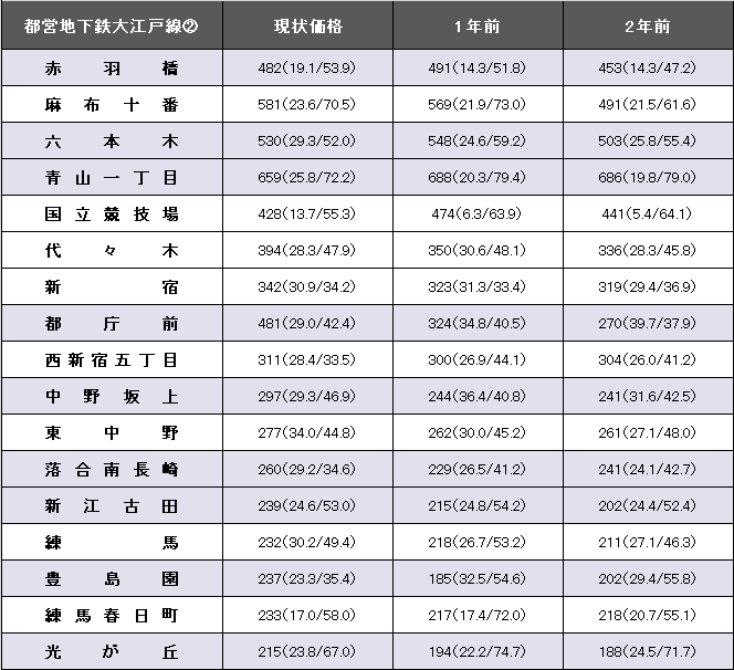 都営地下鉄大江戸線(光が丘~新宿〈放射部〉、新宿~都庁前〈環状部〉)における平均坪単価は376万円。1年前に比べて28万円、8.1%上昇した。事例数は5006件(前年より987件減)、平均築年数24.4年(1年前23.2年)、平均専有面積は52.95平方メートル(同56.09平方メートル)だった。今回掲載区間(赤羽橋~光が丘)の最高値は青山一丁目の659万円。