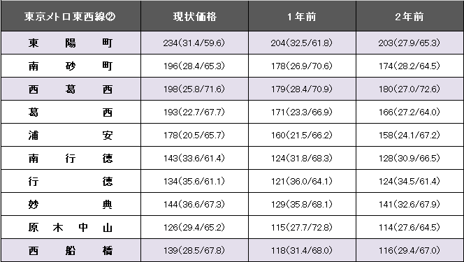 東京メトロ東西線(中野~西船橋)における平均坪単価は226万円で、1年前に比べて23万円、11.3%上昇した。事例数は3106件(前年より1261件減)、平均築年数が29.5年(1年前29.4年)、平均専有面積は57.81平方メートル(同61.51平方メートル)。今回掲載区間(東陽町~西船橋)の最高値は東陽町の234万円。