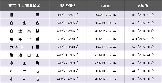 東京メトロ南北線(目黒~赤羽岩淵)における平均坪単価は413万円で、1年前に比べて31万円、8.1%上昇した。事例数は2498件(前年より352件減)、平均築年数が25.3年(1年前23.9年)、平均専有面積は59.28平方メートル(同64.60平方メートル)。今回掲載区間(目黒~市ヶ谷)の最高値は六本木一丁目の590万円。