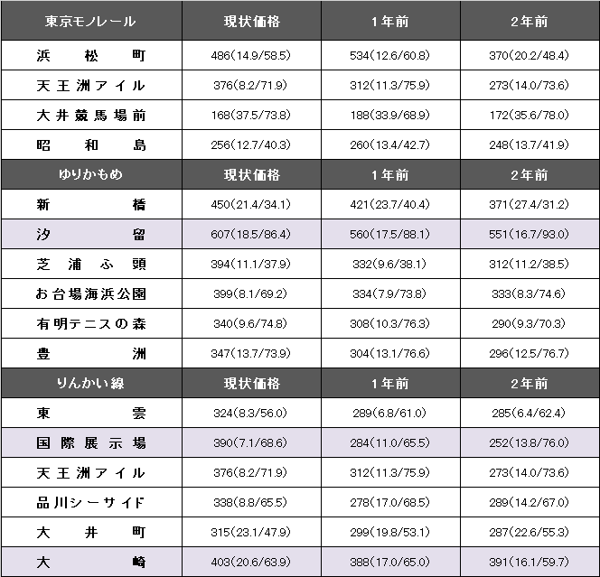 ゆりかもめ(新橋~豊洲)における平均坪単価は379万円。1年前に比べて54万円、16.6%上昇した。事例数は757件(1年前1061件)、平均築年数が13.3年(同12.5年)、平均専有面積は72.80平方メートル(同75.70平方メートル)。最高値は汐留の607万円。