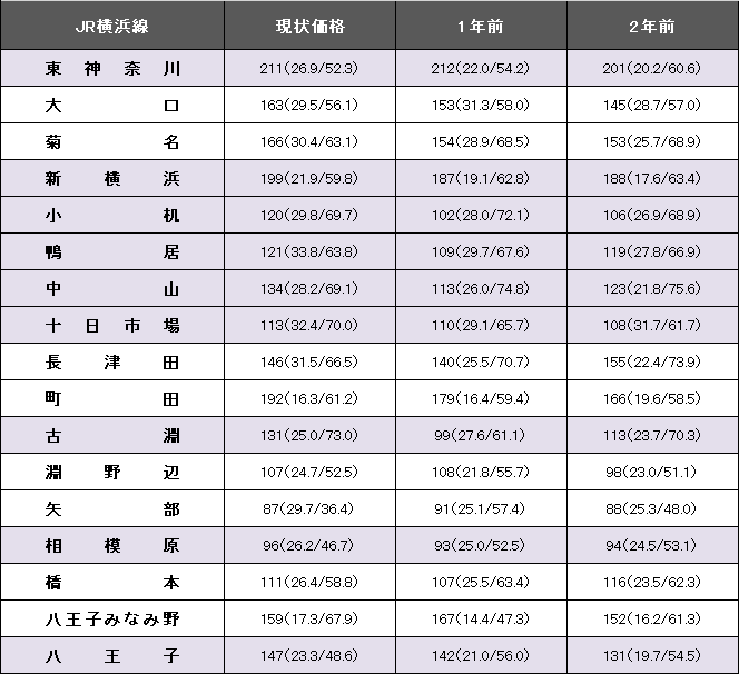 JR横浜線(東神奈川~八王子)における平均坪単価は136万円で1年前に比べて10万円、6.1%上昇した。事例数は2476件(前年より394件減)、平均築年数が26.8年(1年前は24.6年)、平均専有面積は57.34平方メートル(同61.24平方メートル)。掲載区間における最高値は東神奈川の211万円。