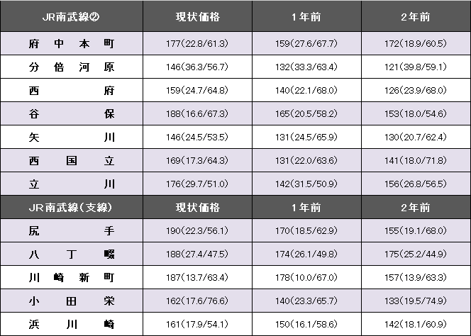 JR南武線(川崎~立川)における平均坪単価は217万円で1年前に比べて23万円、11.7%上昇した。事例数は2336件(前年より306件減)、平均築年数が23.2年(1年前は22.8年)、平均専有面積は56.18平方メートル(同59.00平方メートル)。今回掲載区間(府中本町~立川)の最高値は谷保の188万円。