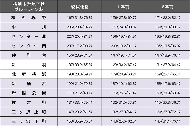 横浜市営地下鉄ブルーライン(あざみ野~湘南台)における平均坪単価は180万円で1年前に比べて19万円、11.7%上昇した。事例数は4082件(前年より390件減)、平均築年数が27.0年(1年前は25.8年)、平均専有面積は58.55平方メートル(同62.07平方メートル)。今回掲載区間(あざみ野~三ツ沢下町)における最高値はセンター南の237万円。