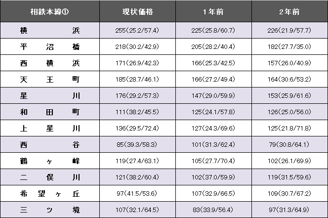 相鉄本線(横浜~海老名)における平均坪単価は164万円で、1年前に比べて22万円、15.8%上昇した。事例数は2068件(前年より113件減)、平均築年数が28.5年(1年前27.3年)、平均専有面積は58.23平方メートル(同60.90平方メートル)だった。今回掲載駅(横浜~三ツ境)における最高値は横浜の255万円。