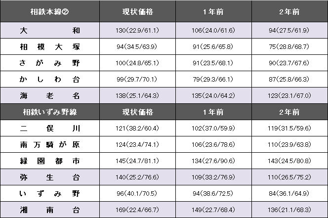 相鉄本線(横浜~海老名)における平均坪単価は164万円で、1年前に比べて22万円、15.8%上昇した。事例数は2068件(前年より113件減)、平均築年数は28.5年(1年前27.3年)、平均専有面積は58.23平方メートル(同60.90平方メートル)だった。今回掲載駅(大和~海老名)における最高値は海老名の138万円。大和は前年に続き二桁の上昇となった。事例数も増えている。海老名は2.2%増で上昇幅は縮小したものの上昇基調が続いた。