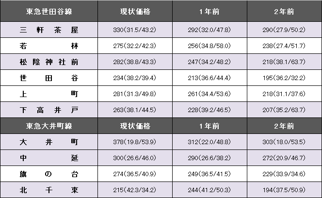 中延は3.4%増で300万円の大台に乗せた。北千束は11.9%減で唯一の下落駅となった。