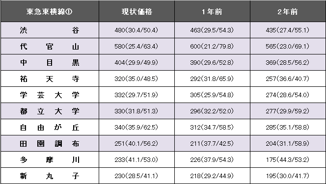 東京メトロ日比谷線も乗り入れる中目黒は、3.6%上昇し、400万円台に乗った。都立大学は二桁のアップとなった。