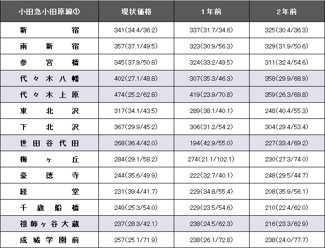 東京の一大ターミナルである新宿駅から神奈川県央地域を通り、同県西部の小田原駅を結ぶ路線。今回の掲載駅はいずれも東京都内。前期は二ケタの大幅下落がいくつか見られたものの、今回下落したのは祖師ヶ谷大蔵のみで、その下落率も0.4%でほぼ横ばいという状況だ。
