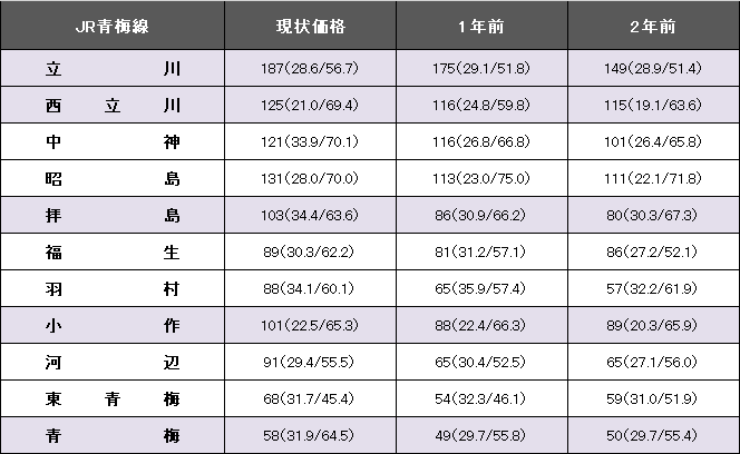 JR青梅線(立川~青梅)における平均坪単価は121万円で、1年前に比べて16万円、14.8%上昇した。事例数は986件(前年より74件増)、平均築年数は29.9年(1年前29.2年)、平均専有面積は59.70平方メートル(同56.90平方メートル)だった。今回掲載区間における最高値は立川の187万円。