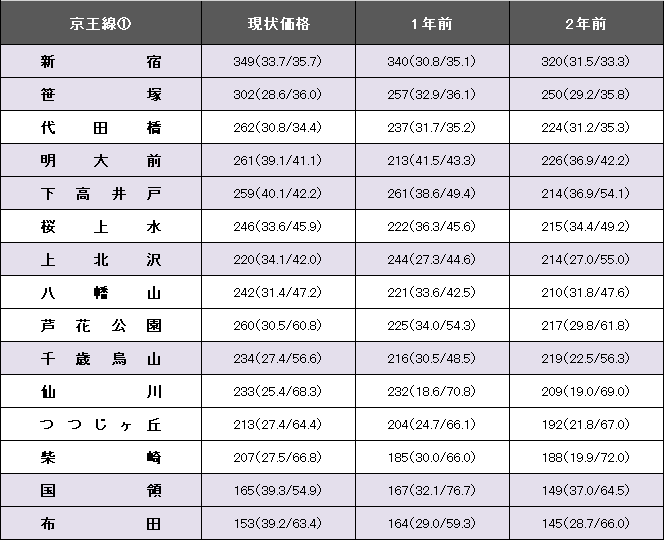 京王線(新宿~京王八王子)における平均坪単価は224万円で、1年前に比べて22万円、11.3%上昇した。事例数は3019件(前年より632件増)、平均築年数は30.3年(1年前29.5年)、平均専有面積は54.31平方メートル(同53.63平方メートル)だった。今回掲載区間(新宿~布田)における最高値は新宿の349万円。