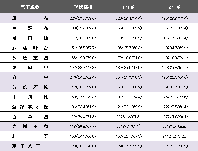京王線(新宿~京王八王子)における平均坪単価は224万円で、1年前に比べて22万円、11.3%上昇した。事例数は3019件(前年より632件増)、平均築年数は30.3年(1年前29.5年)、平均専有面積は54.31平方メートル(同53.63平方メートル)だった。今回掲載区間(調布~京王八王子)における最高値は府中の246万円。
