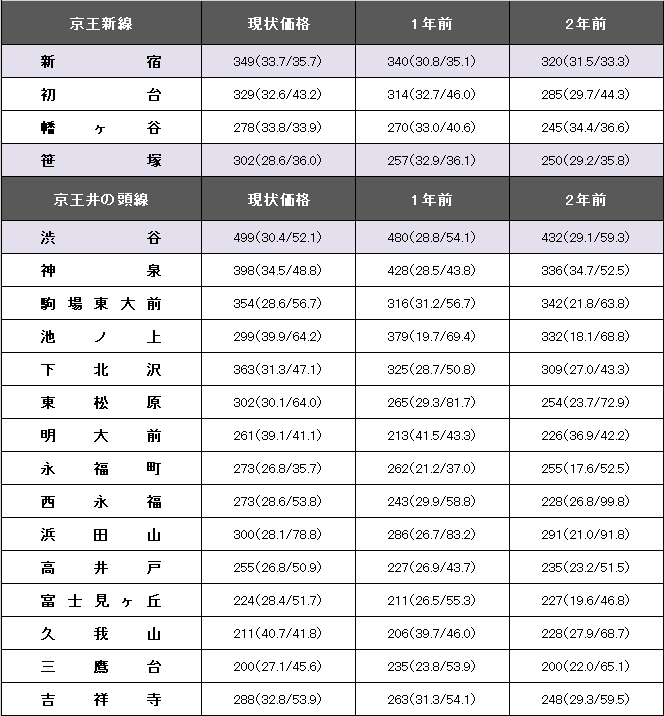 京王新線(新宿~笹塚)における平均坪単価は317万円で、1年前に比べて23万円、8.1%上昇した。事例数は863件(前年より154件増)、平均築年数は32.3年(1年前32.4年)、平均専有面積は37.38平方メートル(同39.51平方メートル)だった。最高値は新宿の349万円。笹塚は同線で唯一の二桁上昇(17.5%増)となった。築浅物件の取引が増えたためと想定される。