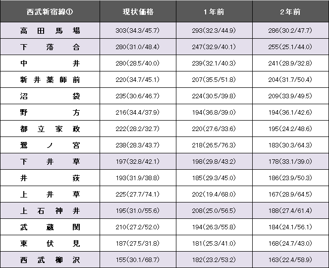 西武新宿線(高田馬場~本川越)における平均坪単価は186万円で、1年前に比べて17万円、10.1%上昇した。事例数は3131件(前年より569件増)、平均築年数は30.9年(1年前29.6年)、平均専有面積は53.95平方メートル(同55.53平方メートル)だった。今回掲載区間(高田馬場~西武柳沢)における最高値は高田馬場の303万円。