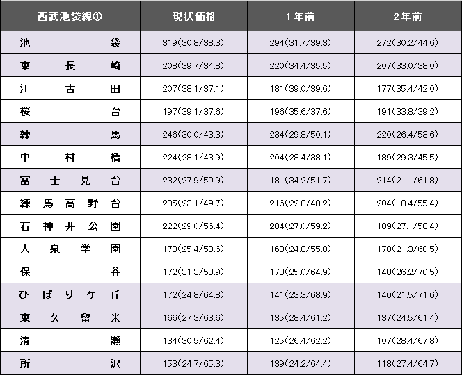 西武池袋線(池袋~飯能)における平均坪単価は204万円で、1年前に比べて28万円、15.8%上昇した。事例数は3139件(前年より513件増)、平均築年数は30.4年(1年前28.7年)、平均専有面積は52.00平方メートル(同55.04平方メートル)だった。今回掲載区間(池袋~所沢)における最高値は池袋の319万円。