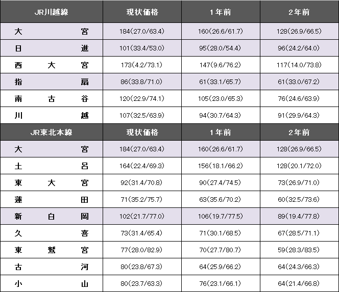 JR東北本線(大宮~小山)における平均坪単価は135万円で、1年前に比べて20万円、18.1%上昇した。事例数は945件(前年より55件増)、平均築年数は27.0年(1年前26.5年)、平均専有面積は66.85平方メートル(同66.71平方メートル)だった。掲載区間における最高値はJR川越線同様、大宮の184万円だった。新白岡は掲載区間の中で唯一下落となったが、100万円台を維持した。
