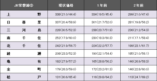 JR常磐線(上野~天王台)の平均坪単価は184万円で、1年前から9.8%、16万円上昇した。事例数は3449件(前年より405件増)、平均築年数が26.7年(1年前26.3年)、平均専有面積は61.85平方メートル(同61.11平方メートル)。今回掲載区間(上野~松戸)の最高値は、上野の338万円。