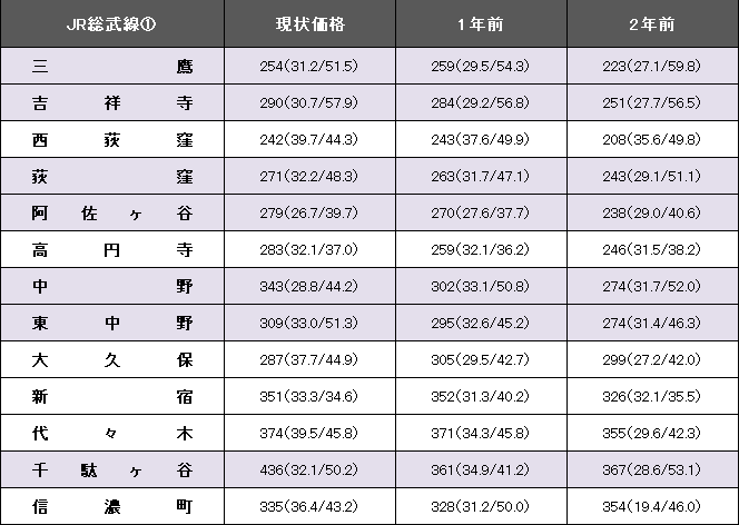 JR総武線(三鷹~千葉)の平均坪単価は252万円で、1年前から5.4%、13万円上昇した。事例数は9366件(前年より1295件増)、平均築年数が30.1年(1年前28.8年)、平均専有面積は55.75平方メートル(同55.36平方メートル)。今回掲載区間(三鷹~信濃町)の最高値は、千駄ヶ谷の436万円。