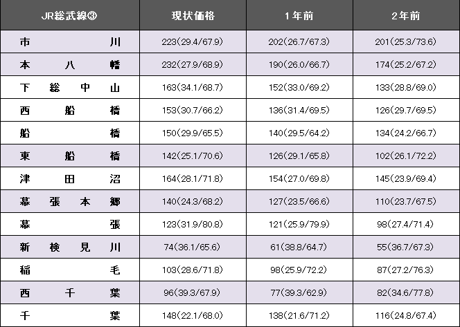 JR総武線(三鷹~千葉)の平均坪単価は252万円で、1年前から5.4%、13万円上昇した。事例数は9366件(前年より1295件増)、平均築年数が30.1年(1年前28.8年)、平均専有面積は55.75平方メートル(同55.36平方メートル)。今回掲載区間(市川~千葉)の最高値は、本八幡の232万円。