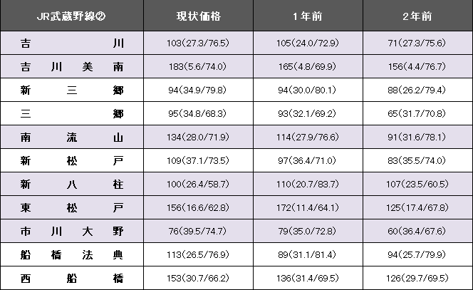 JR武蔵野線(府中本町~西船橋)の平均坪単価は146万円で、1年前から9.5%、12万円上昇した。事例数は2240件(前年より414件増)、平均築年数が27.7年(1年前27.2年)、平均専有面積は68.23平方メートル(同68.56平方メートル)。