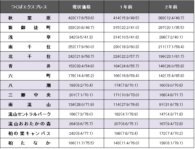 つくばエクスプレス線(秋葉原~柏たなか)の平均坪単価は252万円。1年前に比べて11.4%上昇した。事例数は1578件(前年よりも209件増)、平均築年数が17.7年(1年前は18.2年)、平均専有面積は59.41平方メートル(同59.27平方メートル)だった。同区間の最高値は秋葉原の423万円。