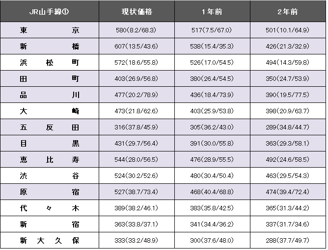 JR山手線(品川~田端~東京~品川と回る環状線)の平均坪単価は396万円。1年前に比べて29万円、8.0%上昇した。事例数は8757件(前年よりも1515件増)、平均築年数が28.7年(1年前は28.3年)、平均専有面積は53.46平方メートル(同50.33平方メートル)だった。今回掲載区間(東京~新大久保)の最高値は新橋の607万円。