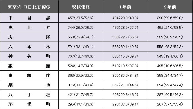 東京メトロ日比谷線(中目黒~北千住)の平均坪単価は414万円で1年前に比べて22万円、5.5%上昇した。事例数は4832件(前年より897件増)、平均築年数が26.0年(1年前は24.7年)、平均専有面積は52.21平方メートル(同51.80平方メートル)。今回掲載区間(中目黒~茅場町)の最高値は神保町の707万円。