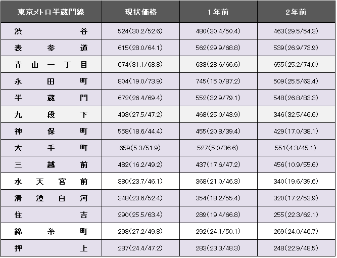東京メトロ半蔵門線(渋谷~押上)における平均坪単価は449万円で1年前に比べて23万円、5.4%上昇した。事例数は2647件(前年より200件減)、平均築年数が26.7年(1年前25.7年)、平均専有面積は54.76平方メートル(同55.83平方メートル)。最高値は永田町の804万円。