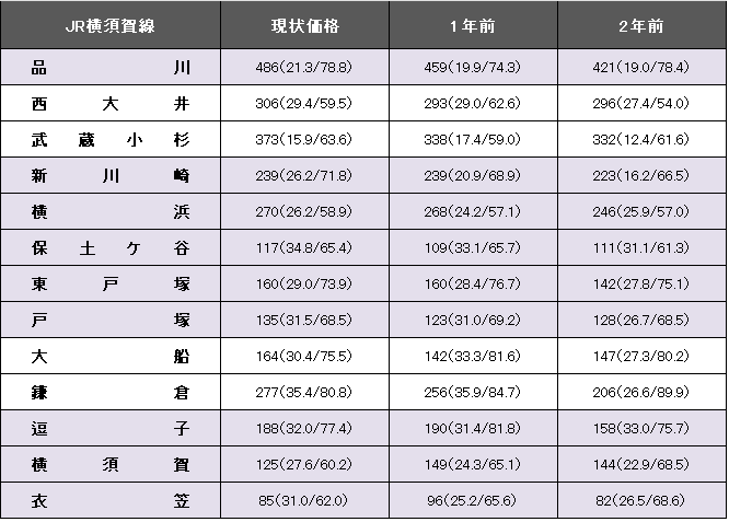 JR横須賀線(東京~久里浜)の平均坪単価は238万円で1年前に比べて5万円、2.1%上昇した。事例数は4692件(前年より1012件増)、平均築年数が27.8年(1年前26.5年)、平均専有面積は69.40平方メートル(同68.91平方メートル)。同路線の最高値は品川の486万円。