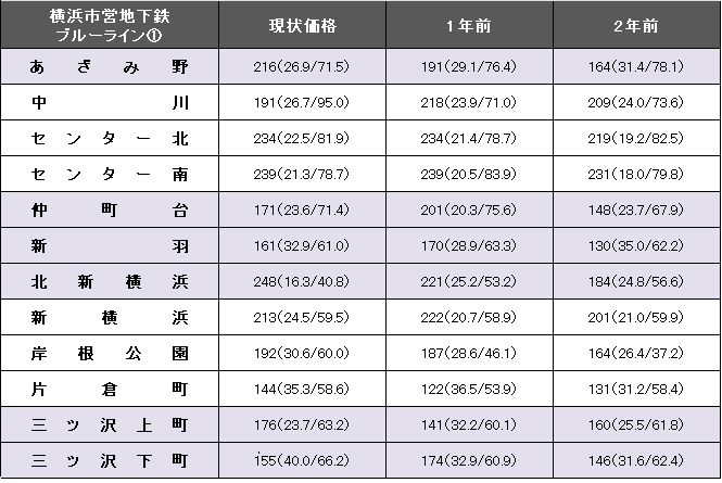 横浜市営地下鉄ブルーライン(あざみ野~湘南台)における平均坪単価は195万円で1年前に比べて7万円、3.6%上昇した。事例数は5631件(前年より851件増)、平均築年数が28.1年(1年前と変わらず)、平均専有面積は60.69平方メートル(同58.89平方メートル)。今回掲載区間(あざみ野~三ツ沢下町)における最高値は北新横浜の248万円。