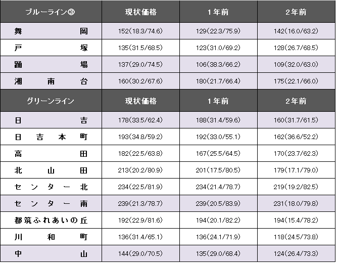横浜市営地下鉄グリーンライン(日吉~中山)の平均坪単価は188万円で1年前に比べて3万円下落した。事例数は1257件(前年より405件増)、平均築年数が29.1年(1年前は27.2年)、平均専有面積は68.26平方メートル(同67.70平方メートル)。同区間の最高値はセンター南の239万円。