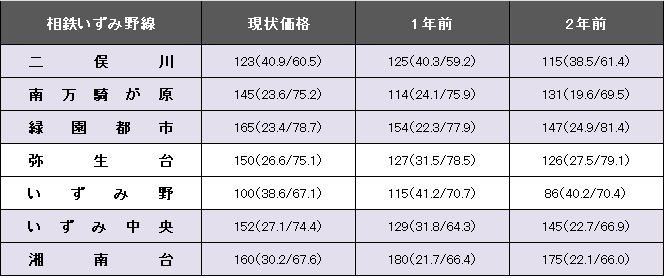相鉄いずみ野線(二俣川~湘南台)における平均坪単価は138万円で1年前に比べて3万円下落した。事例数は602件(前年より84件増)、平均築年数が34.2年(1年前は32.0年)、平均専有面積は66.23平方メートル(同65.76平方メートル)。同区間における最高値は緑園都市の165万円。ファミリー向け物件の多い路線だ。