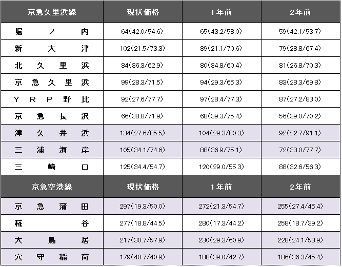 京急久里浜線(堀ノ内~三崎口)における平均坪単価は95万円で、1年前に比べて4万円上昇した。事例数は430件(前年より71件増)、平均築年数は32.9年(1年前32.8年)、平均専有面積は68.32㎡(同67.07㎡)だった。最高値は津久井浜の134万円。