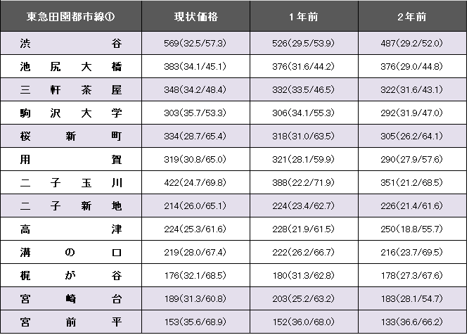 東急田園都市線(渋谷~中央林間)の平均坪単価は267万円で、1年前から1万円下落した。事例数は6782件(前年より484件増)、平均築年数が30.9年(1年前29.8年)、平均専有面積は63.62平方メートル(同62.42平方メートル)。今回掲載区間(渋谷~宮前平)における最高値は渋谷の569万円。