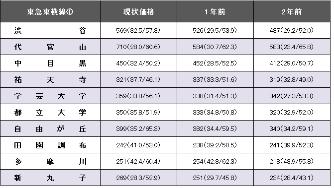 前期は横ばいだった代官山が21%の大幅上昇となり、坪700万円台を突破した。掲載区間の各駅で築年数の上積みが見られる中、平均築年数が28年に若返った。