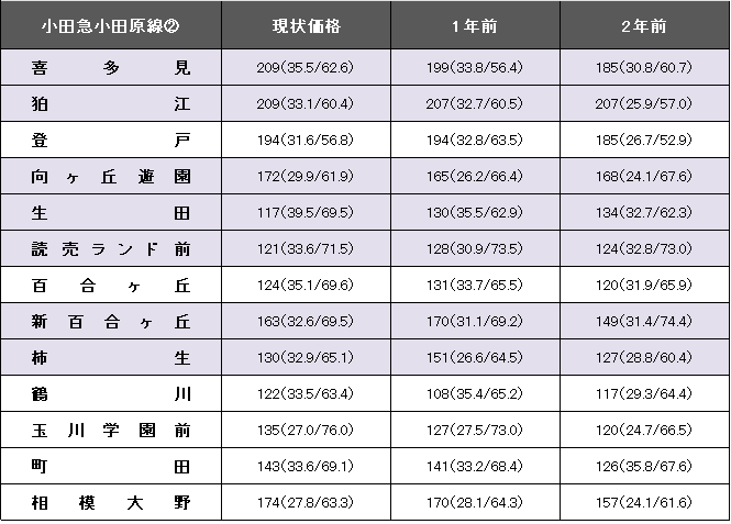 小田急小田原線(新宿~小田原)の平均坪単価は189万円で、1年前に比べて3万円上昇した。事例数は6172件(前年より907件増)、平均築年数は32.7年(1年前31.7年)、平均専有面積は63.39平方メートル(同62.56平方メートル)だった。今回掲載区間(喜多見~相模大野)における最高値は喜多見と狛江の209万円。