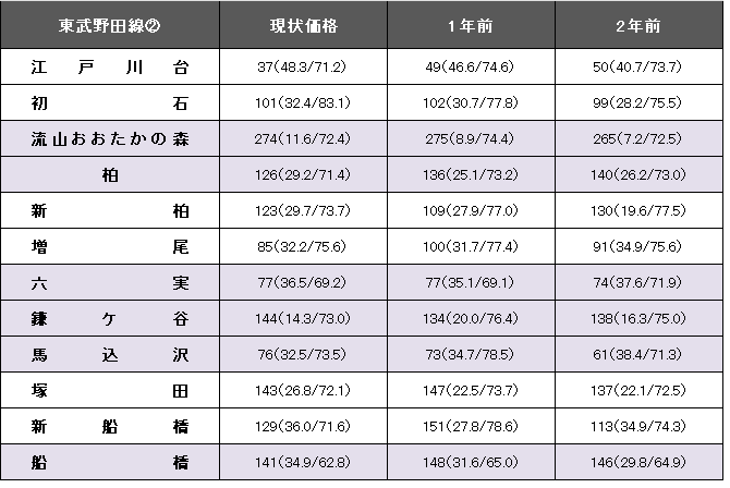 千葉県にかかる今回区間は下落駅が前期から増加した。流山おおたかの森はわずかに下落した。同路線内では築浅事例の多い駅だが、今期は築古化が進んだ。