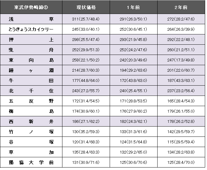 東武伊勢崎線(浅草~伊勢崎)における平均坪単価は154万円で、1年前に比べて10万円、6.4%下落した。事例数は4222件(前年より282件減)、平均築年数は31.0年(1年前29.2年)、平均専有面積は61.54平方メートル(同60.54平方メートル)だった。今回掲載区間(浅草~獨協大学前)における最高値は浅草の311万円。